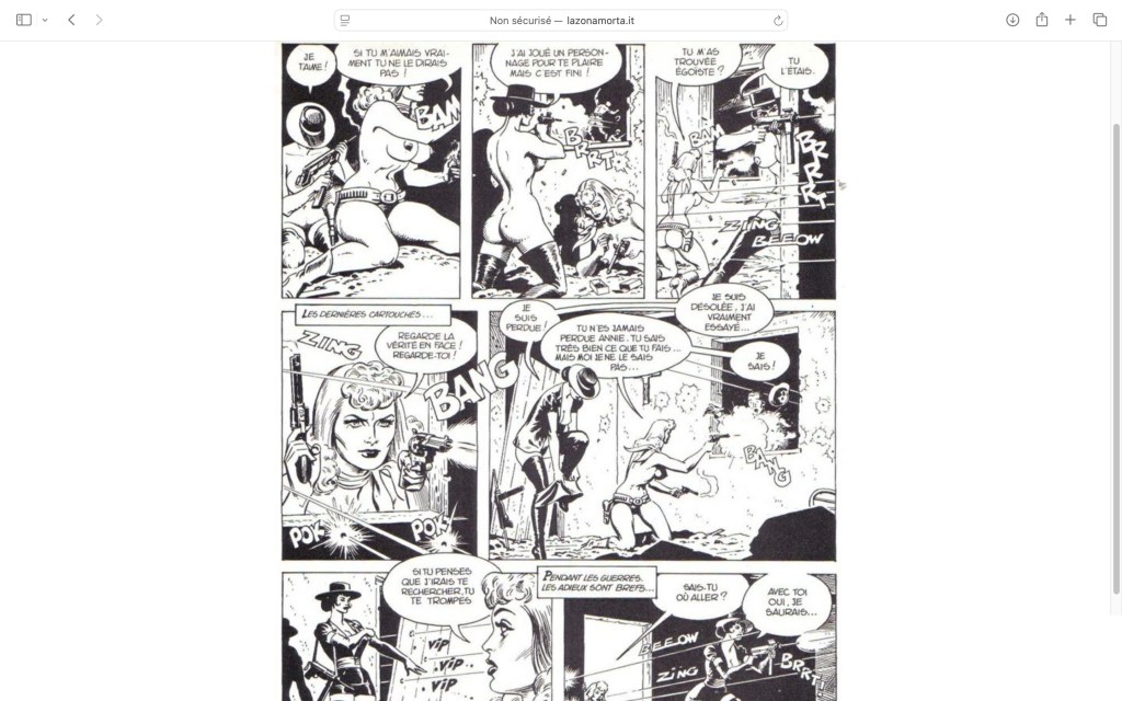 Aller au fond, recommencer éternellement, aller chercher plus loin que ça, plus loin que toi, Ana. Sinon je suis condamné. Je sens bien que je suis prêt à me détacher. Un peu. Passer le gué. Partir avec toi et les amis que je me suis créés, aller chercher plus loin, au-delà des pontons, aller ailleurs, aller avec l’esprit. J’ai grandi, moi aussi, dans la ville près de la mer et du fleuve. Et maintenant qu’on se connait, tu m’accompagnes. Nous partons. Une idée chassant l’autre, de Teddy Ted je suis allé chercher les Cow-Girls at War. Je ne savais pas comment faire, je voulais t’en parler, j’avais oublié le titre, l’auteur, je me rappelais où je les avais vues, il y a quarante ans, ces filles, j’ai fouillé, j’ai retrouvé les planches. Un souvenir, une impression forte. Les Cow-Girls étaient toujours là. Je te les ai montrées. Des dizaines d’années après, elles n’avaient pas disparu, elles étaient belles, s’embrassaient sous les balles, des mots d‘amour délicats, humides, des caresses mystérieuses, un humour délicieux, tu ne peux pas comprendre.